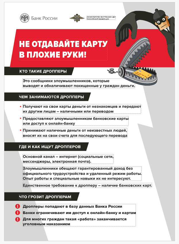 Информация по безопасности, а именно про дропперство и мошенников.